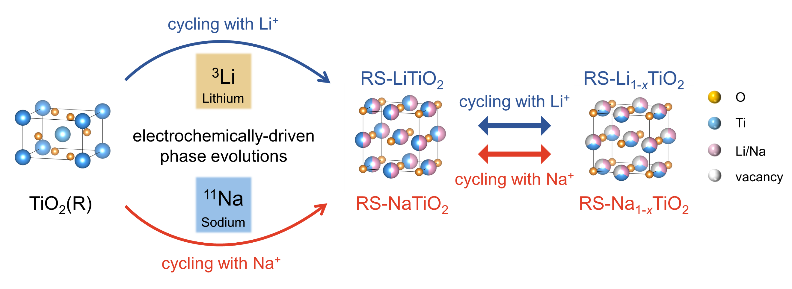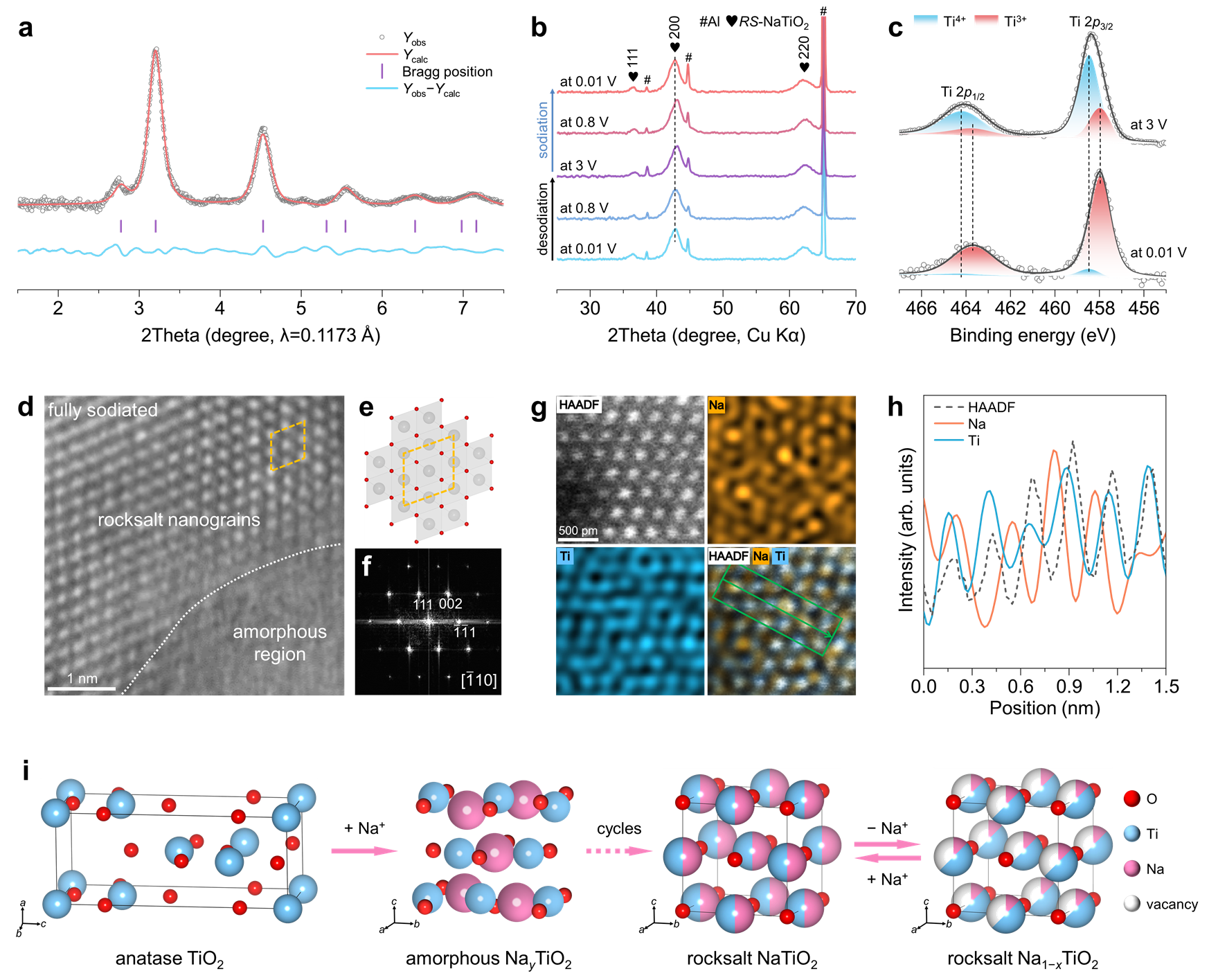 图1.岩盐相NaTiO2的储钠机制表征与TiO2(A)负极循环时的结构演变示意图
