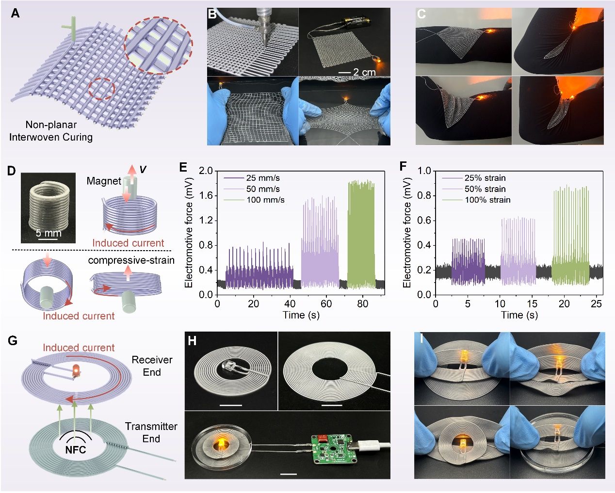 这种乳液不仅适用于独立的直接墨水书写(DIW)3D打印,还能作为内芯油墨应用于同轴3D打印。打印过程中,SALM-HIPE通过同轴喷嘴的内通道挤出,而功能性热固性鞘层油墨通过外通道输送,形成以SALM-HIPE为导电内芯的同轴结构纤维。SALM-HIPE的塑性流动行为实现了稳定的内芯流动,并与多种低粘度护套材料兼容,能够制造出具有可调节芯直径、高分辨率和快速3D打印能力的同轴导电纤维。这些高弹性纤维在可穿戴电子产品、电磁信号传输和无线电力传输系统中具有广阔的应用前景。