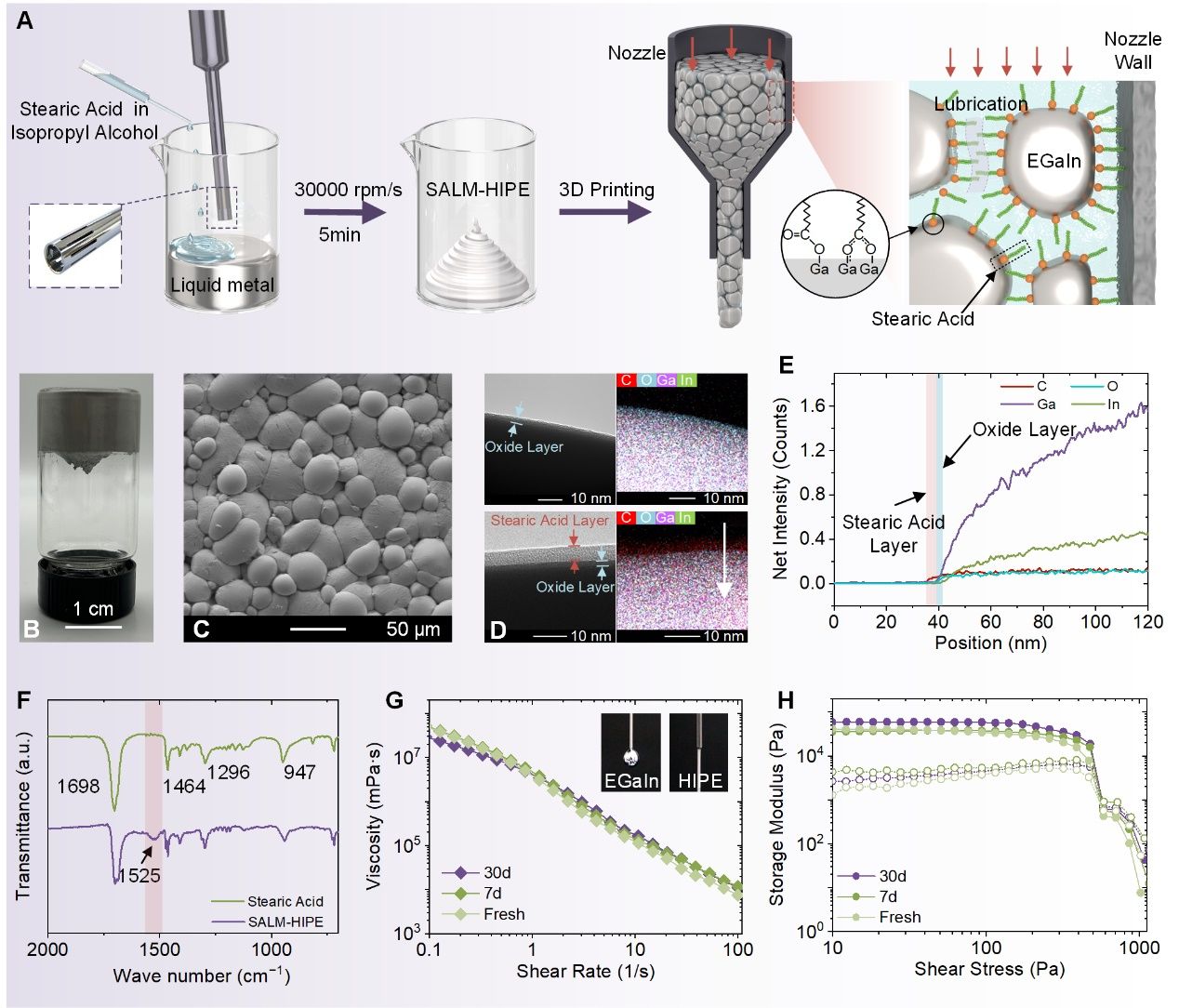 为克服这一挑战,厦门大学白华教授团队提出了一种创新的液态金属流变学改性策略。团队通过将硬脂酸异丙醇溶液与液态金属相结合,成功制备了化学性质稳定的液态金属有机高内相乳液(SALM-HIPEG)。在乳液中,硬脂酸不仅作为分散剂,还在液滴表面形成润滑层,有效减少摩擦,防止液滴间的聚结和破乳现象,从而提高了乳液的稳定性和流动性。因此,SALM-HIPE能够快速保持打印线条的形状,成为适用于高分辨率和纵横比的DIW 3D打印油墨,并成功打印出精细的3D结构。