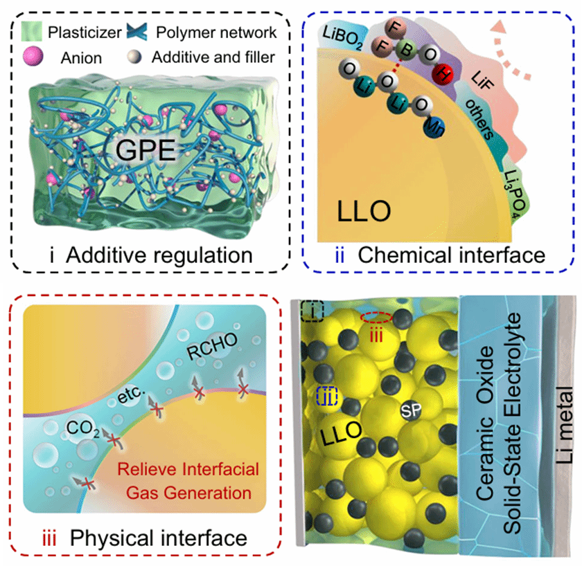 研究团队利用添加剂改变了GPE中的Li离子化学环境,由此增强交联的GPE可以更有效地固定大分子尺寸的阴离子,从而增强整体的抗氧化能力以及Li离子的迁移效率。此外,添加剂的分解促进了富氟、富硼无机CEI层的生成,有效抑制了界面副反应,稳定了正极晶格氧以及抵抗HF腐蚀。在富无极组分的CEI与高交联的GPE协同作用下,电解质的分解产气、物理接触损失和界面阻抗分化问题得到了有效缓解。