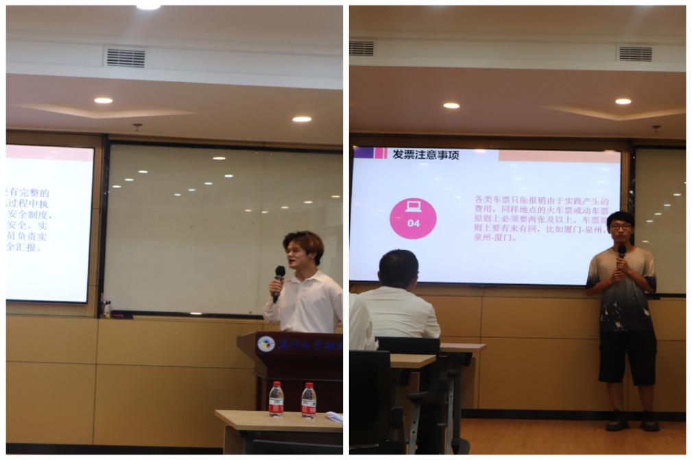 首先,由材料学院本科生团总支实践部郭文宇同学做2023年暑期社会实践经费报销专项培训,接着,实践部庞航同学强调实践过程中的注意事项,就实践过程中可能出现的情况和处理方法做介绍。