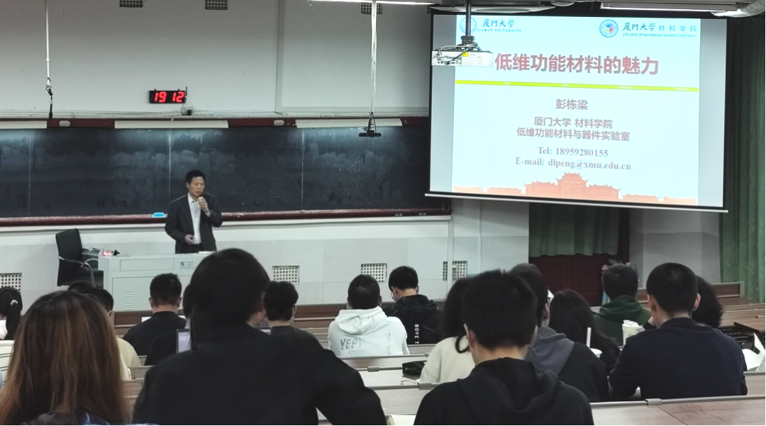 近年来,低维功能材料在能源、电子和光学领域取得了丰硕的应用成果。它们的出现为材料科学带来了新的突破,同时也为解决人类面临的能源危机、电子产品迭代和环境监测等问题提供了新路径。彭栋梁教授首先简述了材料学科的类别与研究方向,介绍了近年来材料科学的发展趋势。之后,彭栋梁教授从低维功能材料的基本概念与特性入手,介绍了低维功能材料在电池、巨磁电阻、量子发光等方面的应用和相关产品的机遇与挑战。讲座结束后是自由提问环节,彭栋梁教授耐心解答疑问,让同学们对该方向有了更深刻的认知。