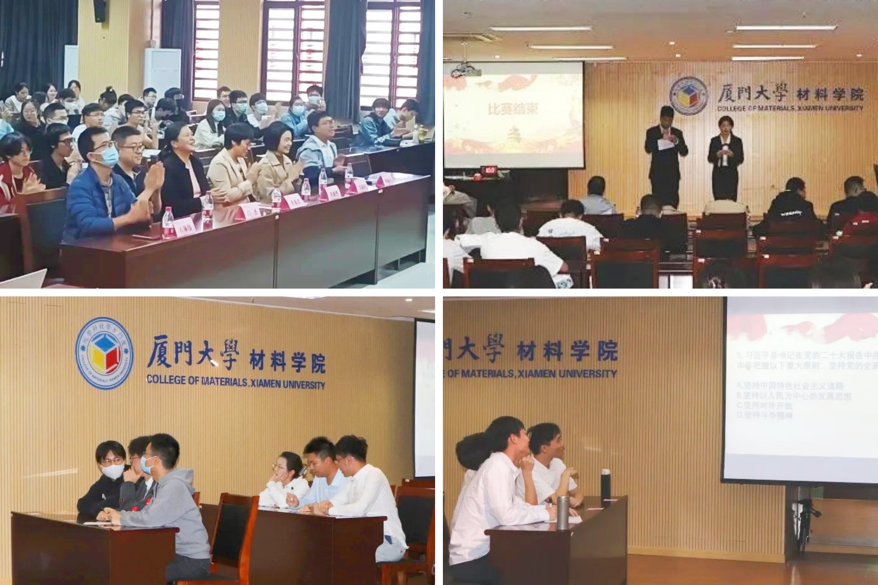 为庆祝党的二十大胜利召开,12月9日下午,厦门大学材料学院第四届党团知识竞赛决赛在厦门大学思明校区圣诺楼成功举行。材料学院党委副书记黄兆君,2022级本科生班主任黄雅熙、李淑星、白杰,学院团委书记石林伟,辅导员林锦昊出席活动。