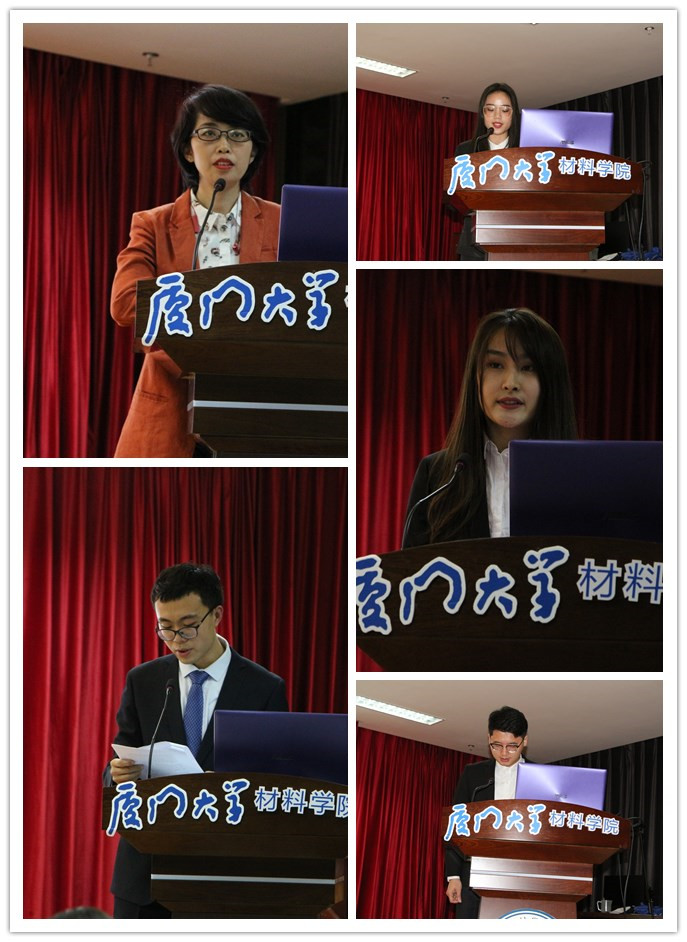周凡代表校研究生会对本次大会的顺利召开表示祝贺,她充分肯定了材料学院研究生会在过去一年开展的工作,期盼材料学院研究生会和校研究生会在今后的日子里能够继续加强合作,增进友谊,携手共同营造我校良好的学风校风。法学院研究生会主席江磊代表兄弟学院研究生会致辞,他希望材料学院和各兄弟学院友谊之树长青,并祝愿厦门大学各级研究生会能够切实成为服务同学、沟通师生、锻炼自我、凝聚人心的学生组织。