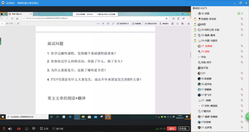 为普及当前保研政策,使我院学生对保研有更明确的认识和了解,对有意向保研的学生进行专业指导,2020年4月25日晚7时整,材料学院学生委员会发展部通过QQ群线上直播平台举办2020年保研经验分享交流会。